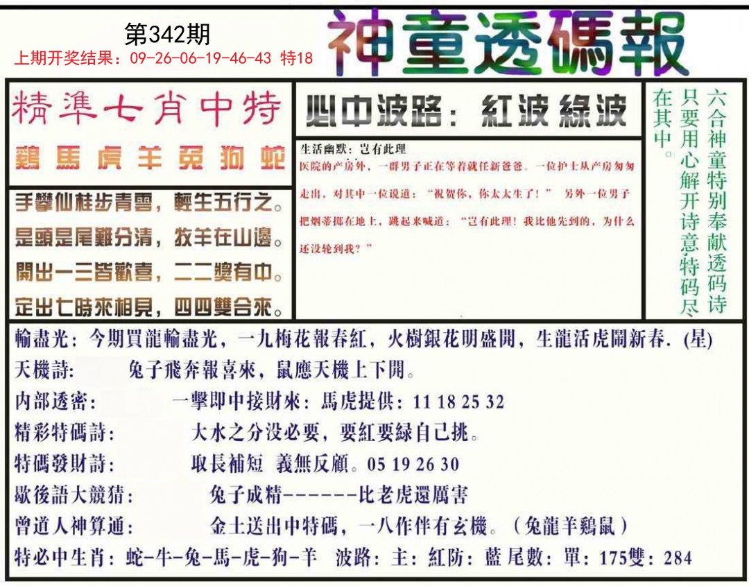 | 342期:九肖 | 虎猴鸡兔狗羊龙蛇马 | 開:?00准 |