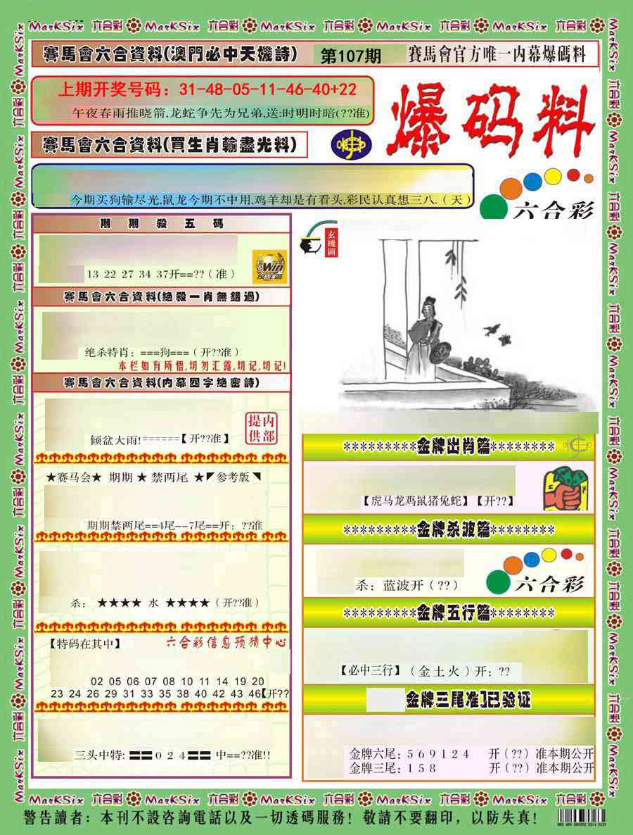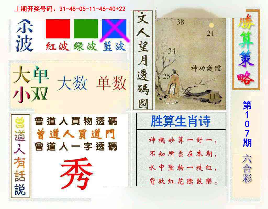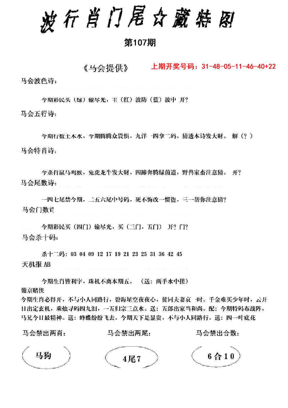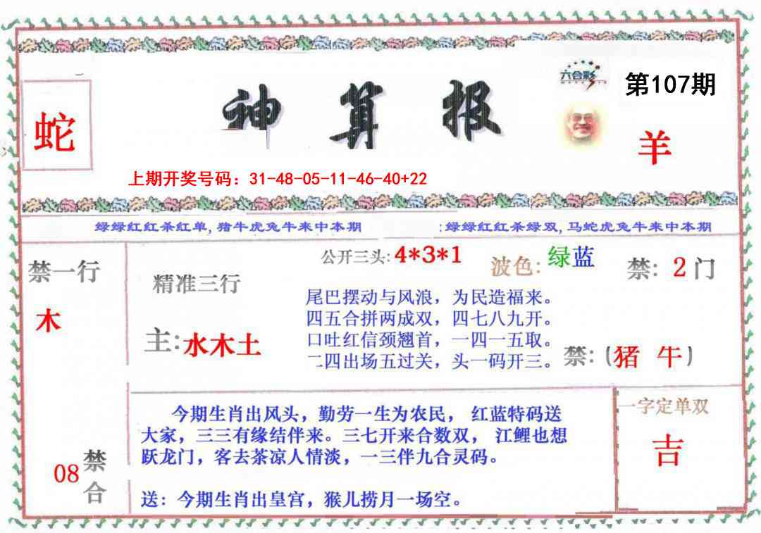 | 106期 | 猴 | 蓝单 | 5尾 | 3 | 開:?00准 |