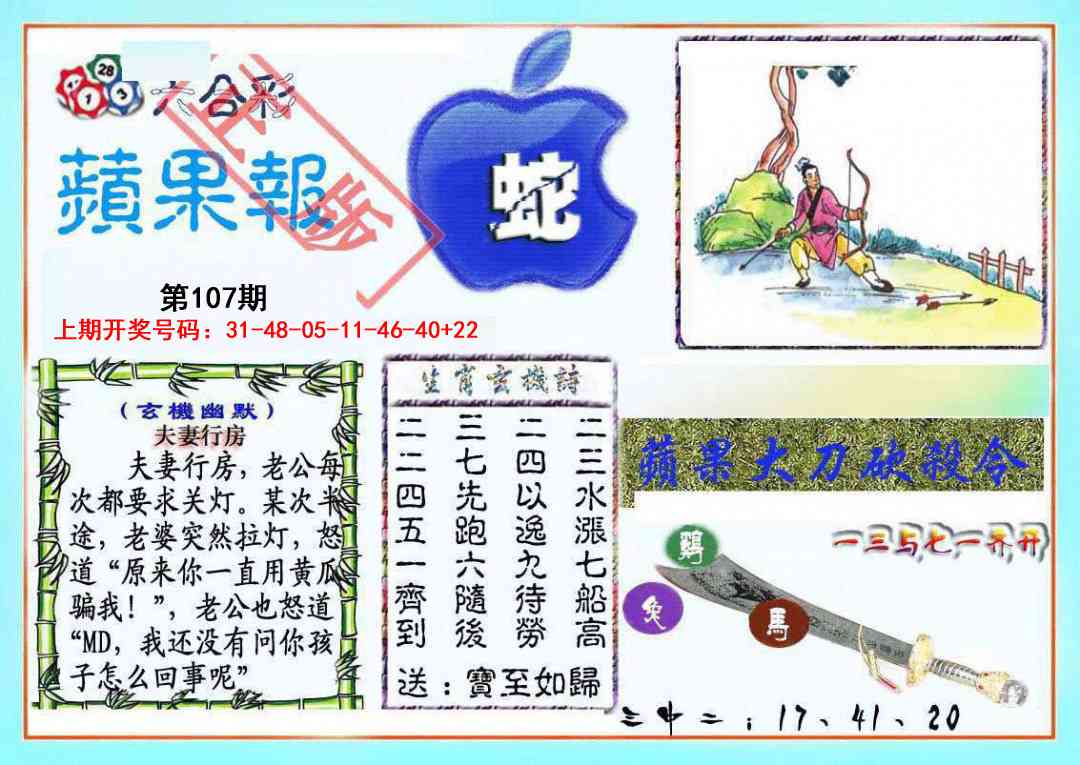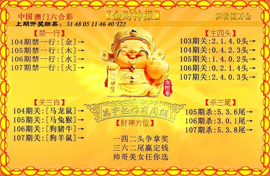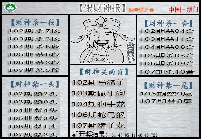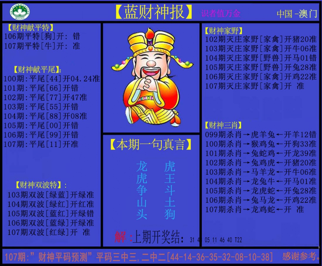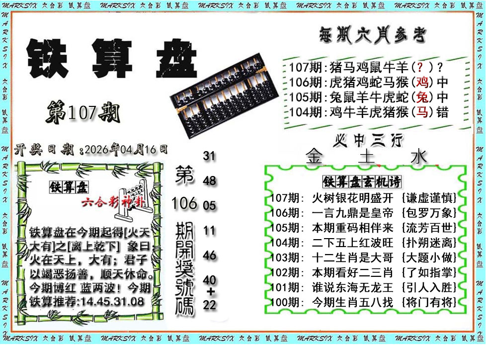 | 106期 | 猴 | 蓝单 | 5尾 | 3 | 開:?00准 |