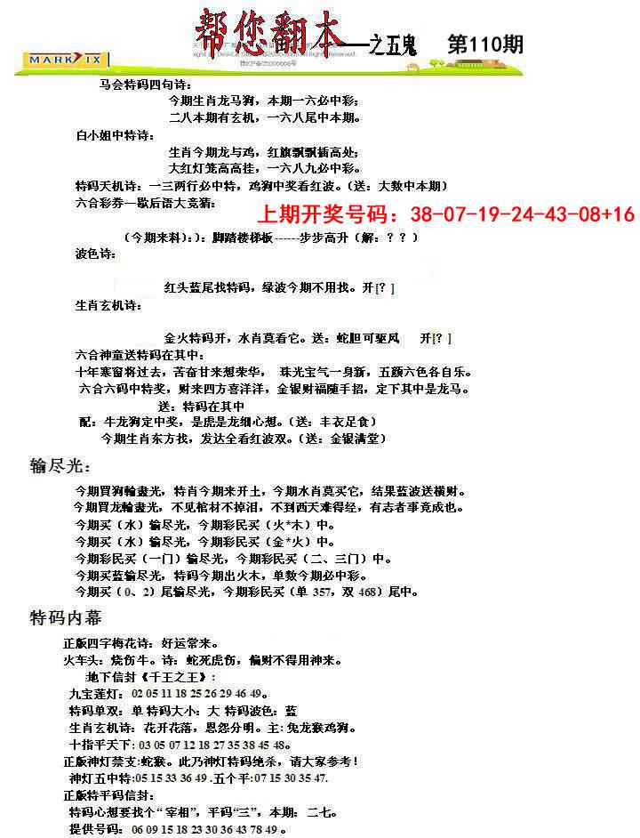 | 109期:⑿码 | 01,05,06,08,11,17 18,30,35,38,46,49 | 開:?00准 |