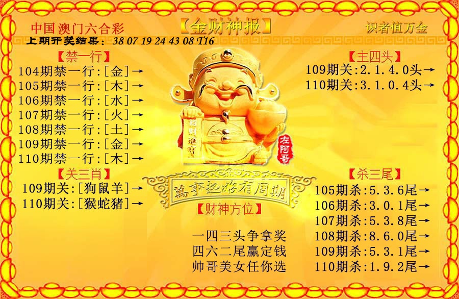 | 108期:四肖 | 虎狗龙猴 | 開:狗45准 |