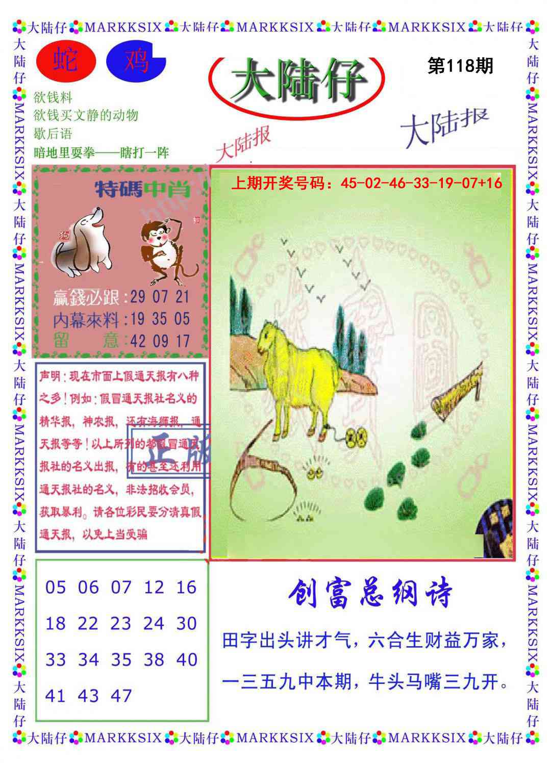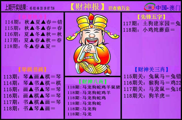 | 118期:五肖 | 牛猪羊龙狗 | 開:?00准 |