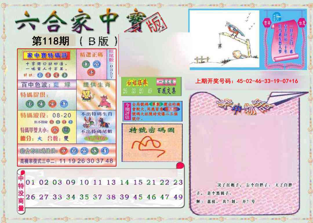 | 118期:家野 | 家禽+龙兔 | 開:?00准 |