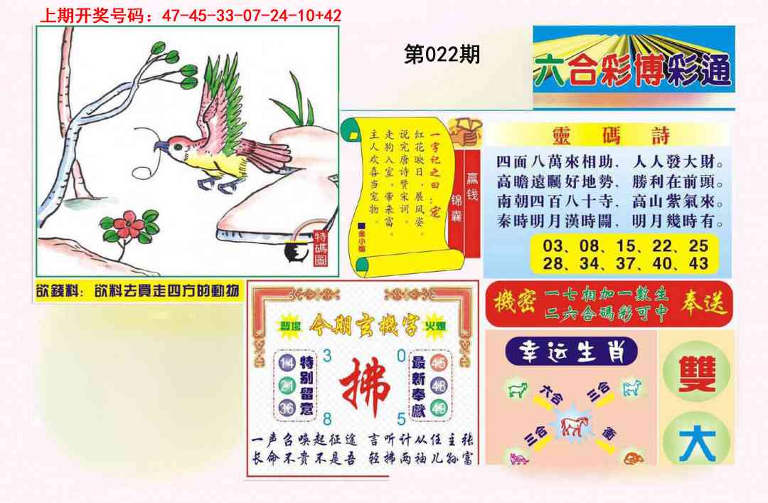 | 021期:⑿码 | 03,06,14,15,21,22 25,26,27,42,43,44 | 開:鼠42准 |
