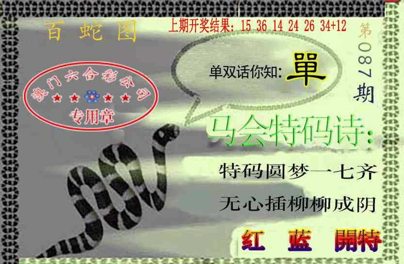 | 086期 | 蛇 | 蓝单 | 9尾 | 1 | 開:?00准 |