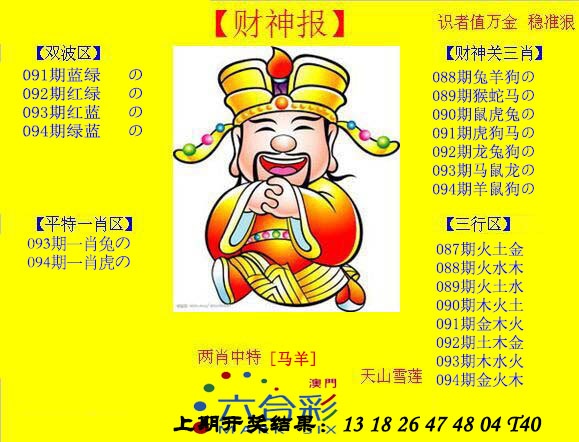 | 093期:七肖 | 羊虎猴马蛇龙狗 | 開:?00准 |