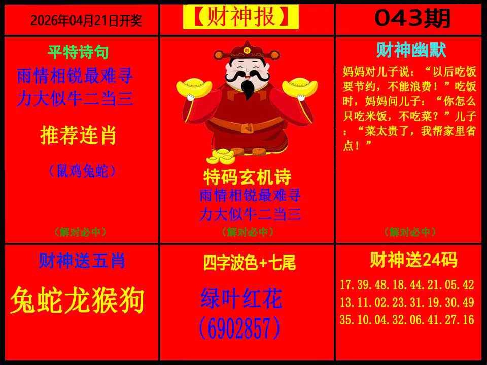 | 094期 | 虎,蛇,马,羊,猴,鸡 | 開:虎17准 |
